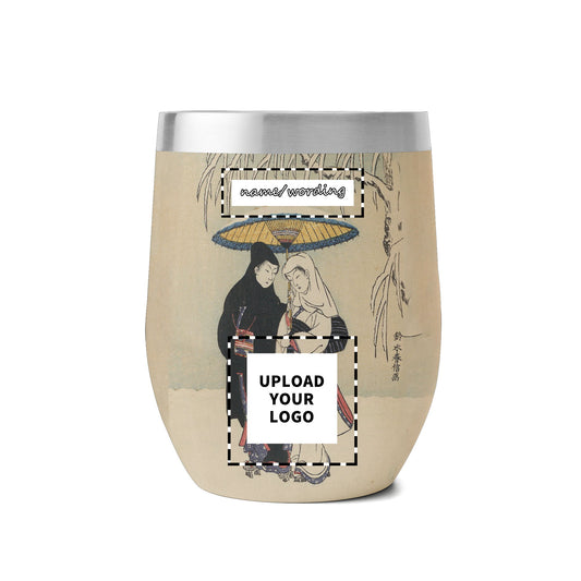 カスタムプリント 12 オンス ステンレススチール ワインタンブラー Pr260: 浮世絵 鈴木春信の雪中傘の下の夫婦 断熱エッグシェルカップ 蓋付き