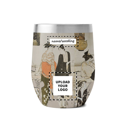カスタムプリント 12 オンス ステンレススチール ワインタンブラー 蓋付き Pr260: 浮世絵 六月、茶室の卵殻カップで夕涼みを楽しむ