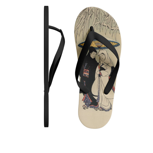 カスタムプリントスリッパ 1916年: 浮世絵 鈴木春信の雪の中の傘を差す夫婦 ビーチサンダル