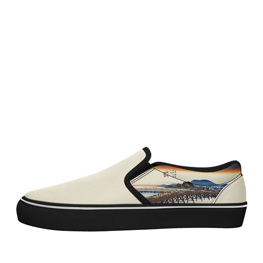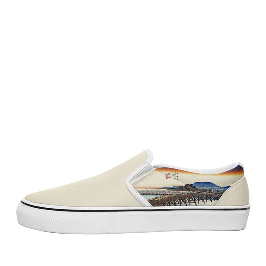 カスタムプリント浮世絵カジュアルシューズ7216:歌川広重の東海道五十三次岡崎矢作橋の橋スニーカーホワイトソール