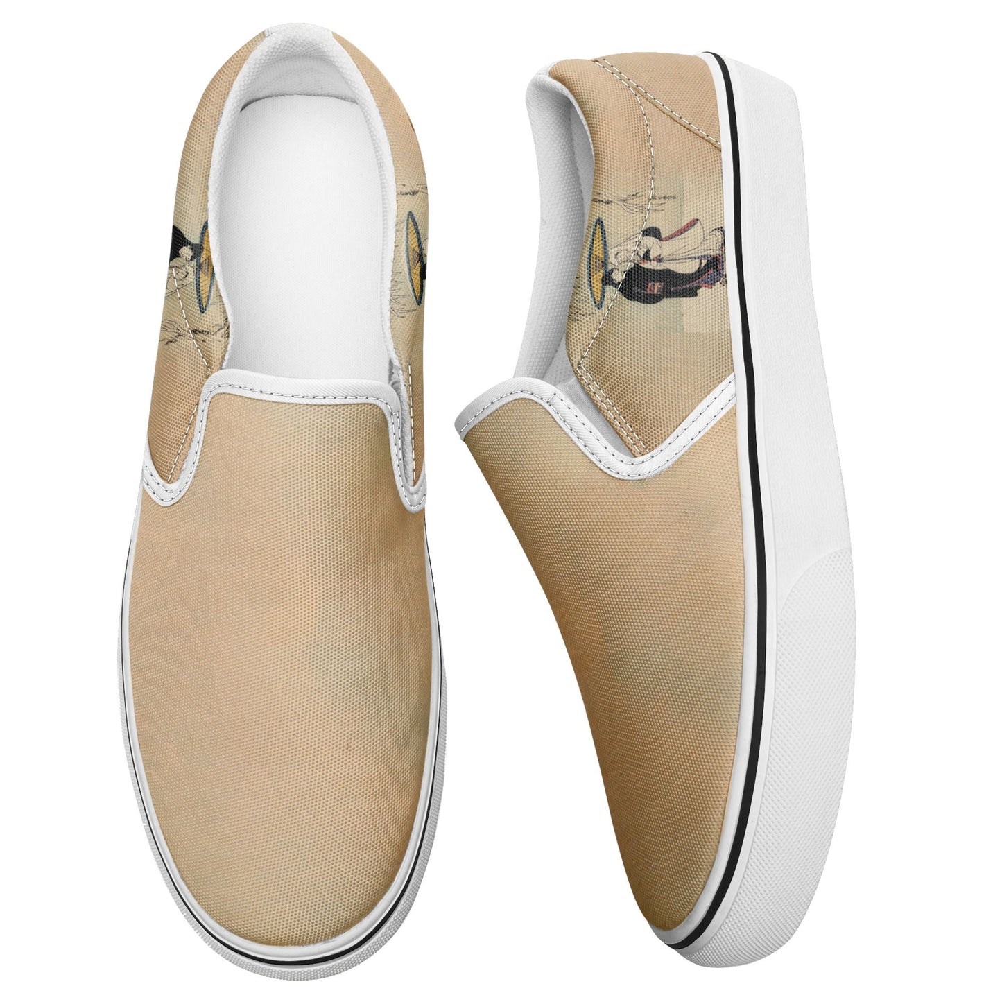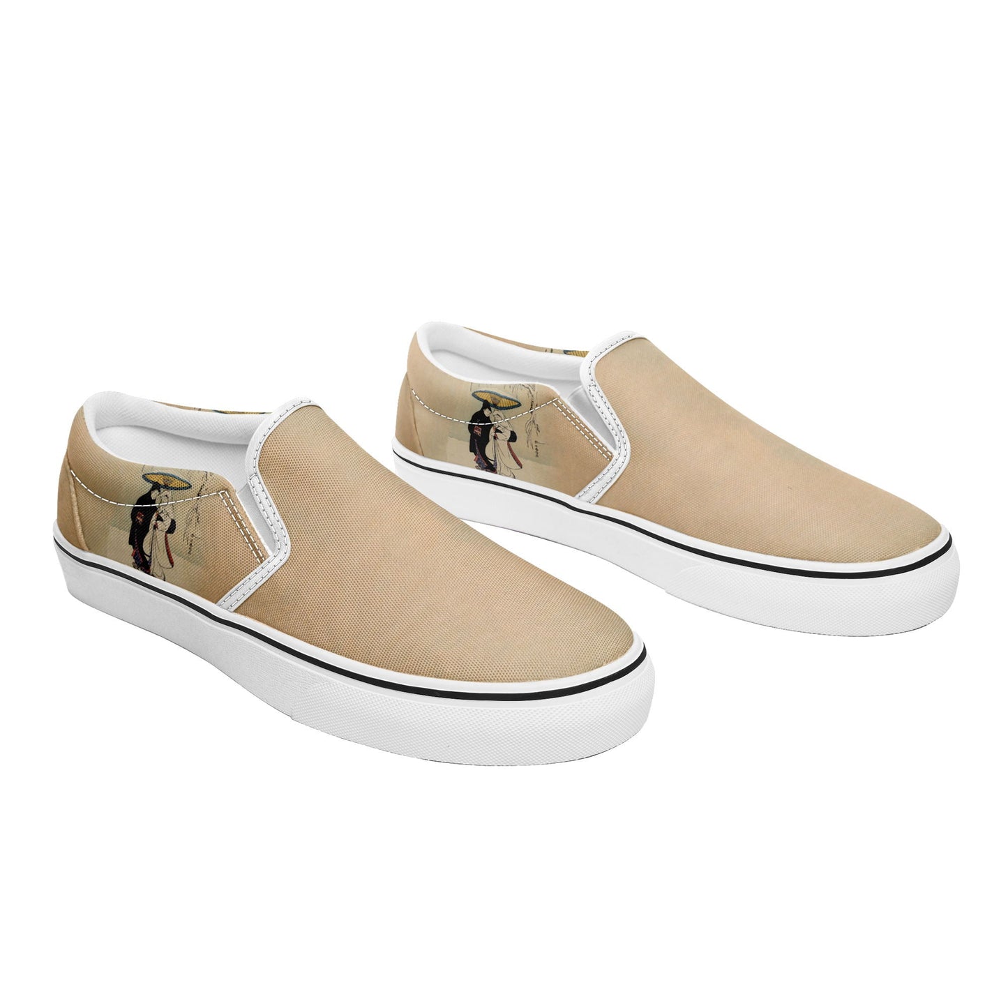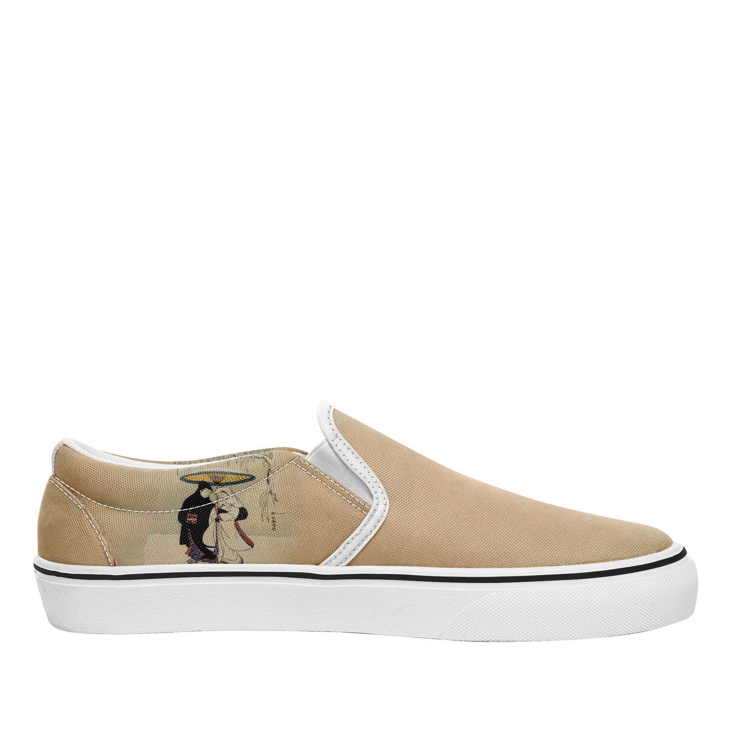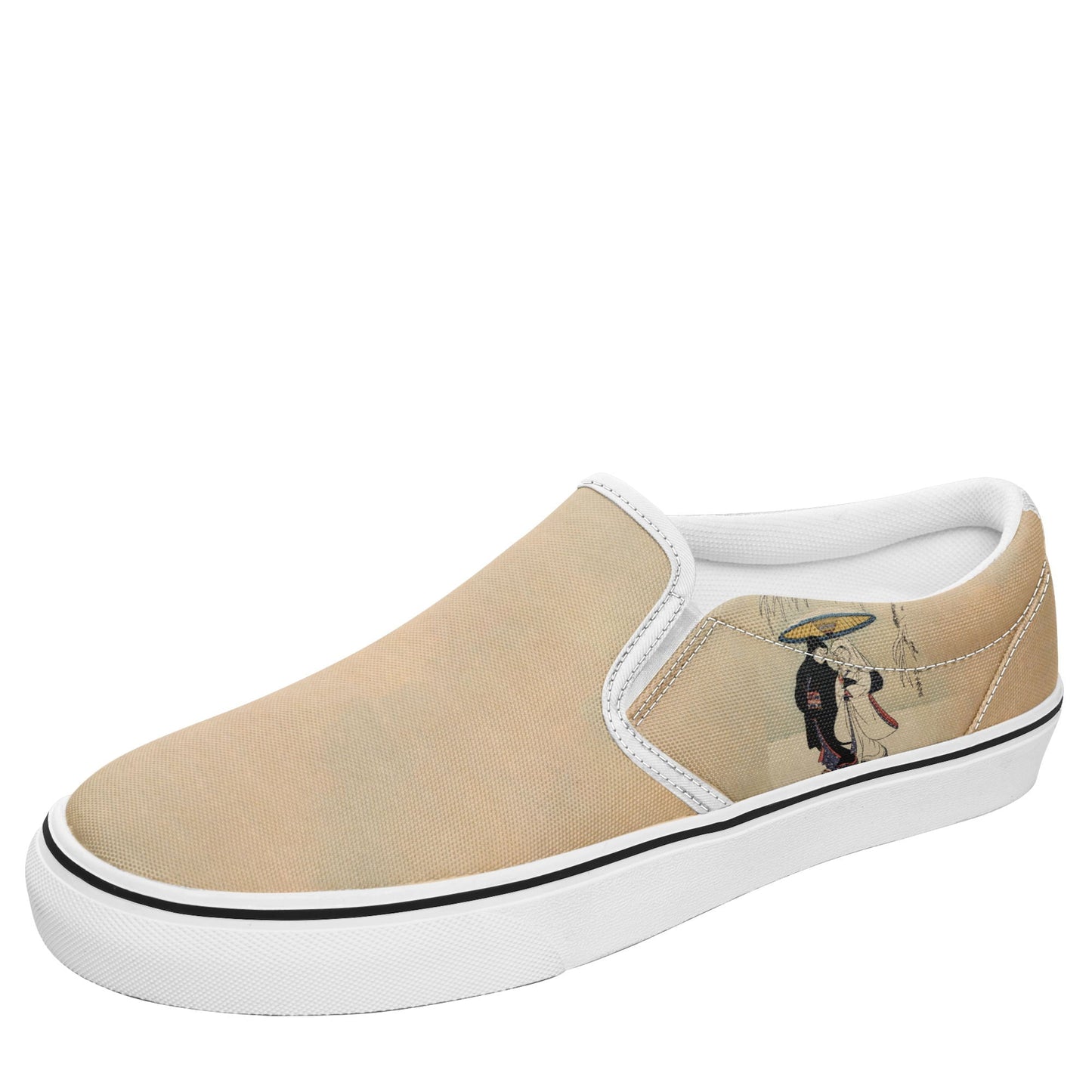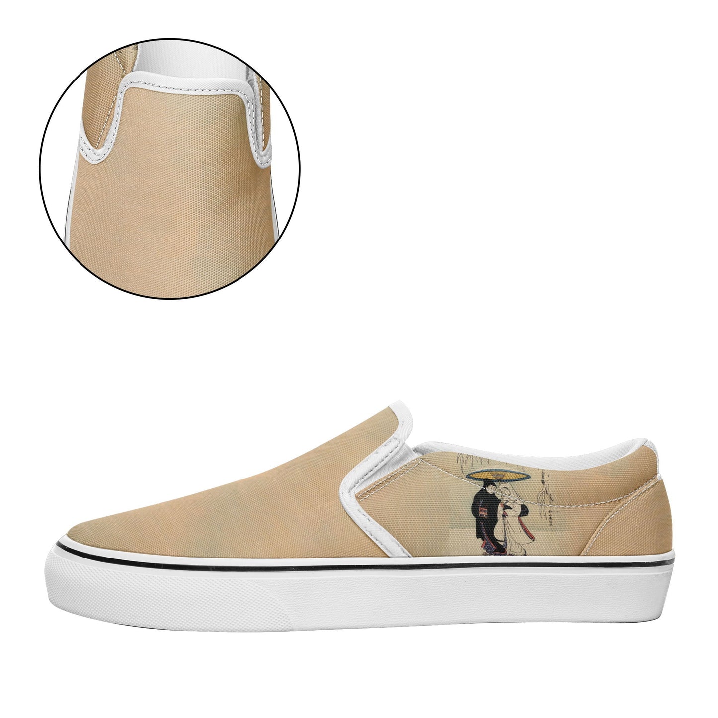 カスタムプリント浮世絵カジュアルシューズ 7216: 鈴木春信の傘を差す夫婦雪中スニーカー ホワイトソール -パーソナライズデザイン POD シューズ 日本のレトロアートスタイル カジュアルシューズ: